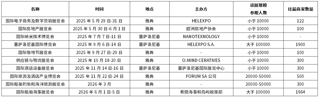 2025至2026年,希腊计划组织约43场展会,主要举办地在雅典和塞萨洛尼基,涉及行业包括食品/果蔬/饮料/酒(9场)、酒店/餐饮/旅游(7场)、建材/石材/照明/暖通(7场)、艺术/宗教(4场)。其中影响力较大的是塞萨洛尼基国际博览会和雅典国际船舶海事展览会。2025年第二、三季度,值得关注的展会有雅典国际电子商务及数字营销展览会(ECDM),将于5月29日至31日在雅典举办;以及塞萨洛尼基国际博览会(TIF),将于2025年9月6日至14日在塞萨洛尼基举办,该博览会历史悠久,是巴尔干地区最大的展览活动。