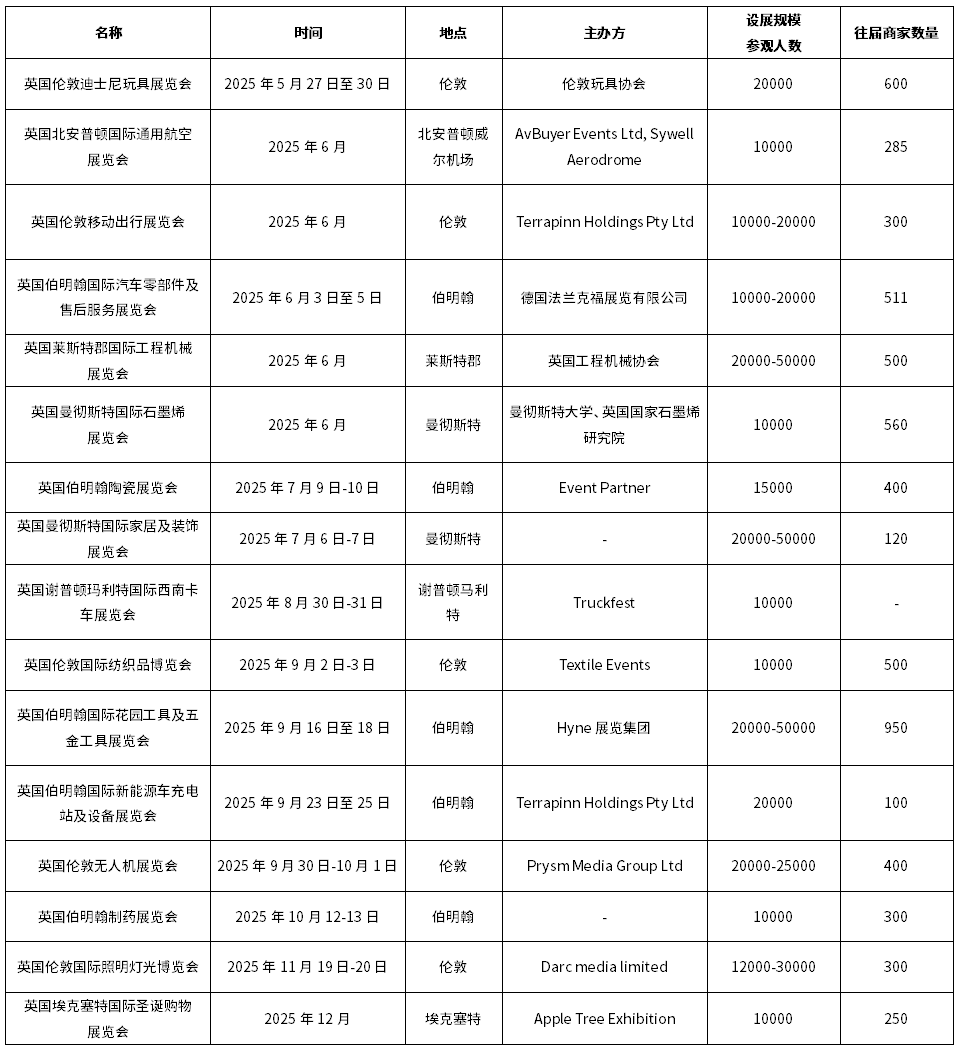 2025至2026年,英国计划组织约314场展会,主要举办地在伦敦和伯明翰,涉及的主要行业包括:建材/石材/照明/暖通(38场)、生物/医疗/保健(26场)、酒店/餐饮/旅游(26场)、汽配/摩配/自行车(18场)、化工/环保/能源(17场)、办公/礼品/消费品/玩具(16场)、机械/五金/工业(15场)、媒体/广告/图书(5场)。2025年第二季度,值得关注的展会有英国伯明翰国际汽车零部件及售后服务展览会(AUTOMECHANIKA BIRMINGHAM),将于2025年6月3日至5日在伯明翰举办;英国莱斯特郡国际工程机械展览会(PLANTWORX),将于2025年6月在莱斯特郡举办。