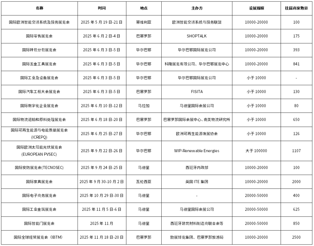 2025至2026年,西班牙计划组织约179场展会,主要举办地在马德里和巴塞罗那,涉及行业包括食品/果蔬/饮料/酒(17场)、建材/石材/照明/暖通(15场)、化工/环保/能源(14场)、机械/五金/工业(14场)、办公/礼品/消费品/玩具(12场)。其中影响力较大的是每年3月举办的巴塞罗那世界移动通信大会。2025年第二季度,值得关注的展会有西班牙巴塞罗那国际零售展览会(SHOPTALK EUROPE),将于2025年6月2日至4日在巴塞罗那举办;国际五金工具展览会,将于6月3日-5日在毕尔巴鄂举办。
