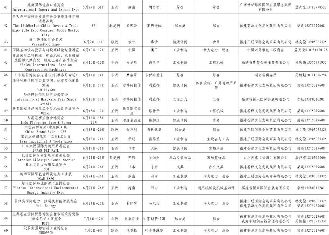 福品出海启新程,拓市扬帆向全球。2月14日,福建省商务厅发布第二批2026年“福品销全球”出境参展拓市场展会名单(共152场,详见文末),重点支持福建省企业开拓“一带一路”沿线国家市场。继2025年11月发布首批361场出境参展拓市场展会名单后,省商务厅广泛征集中国六大行业进出口商会、国际知名展会主办方、地市商务主管部门、有关组展机构和行业商协会意见,鼓励福建省企业出境参展,抢占国际市场。截至目前,2026年“福品销全球”出境参展拓市场展会名单已达513场,涵盖六大洲的58个国家、地区,覆盖13大行业类别和52个细分品类,重点支持纺织服装、机械设备、食品等福建省传统优势产业出海。