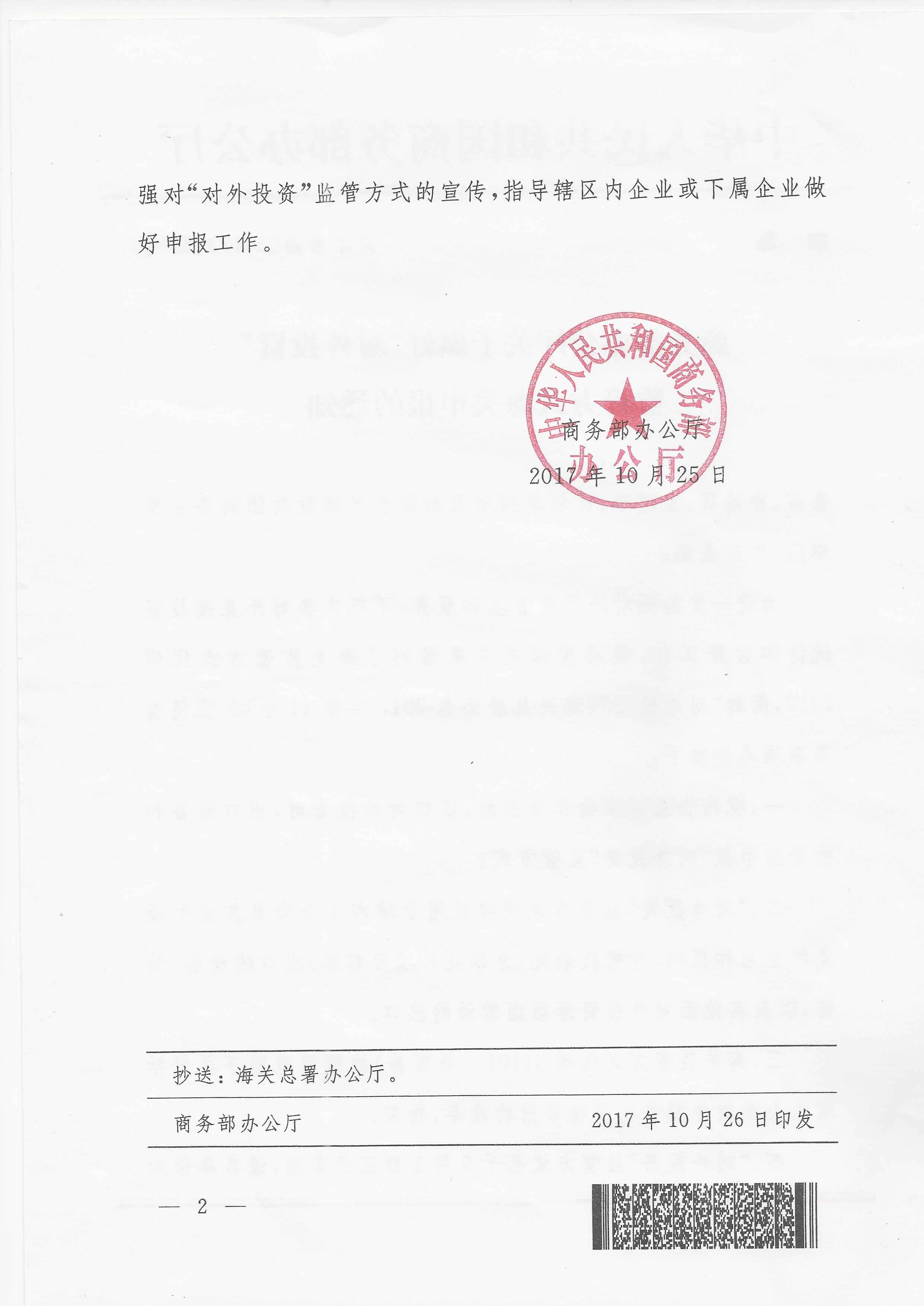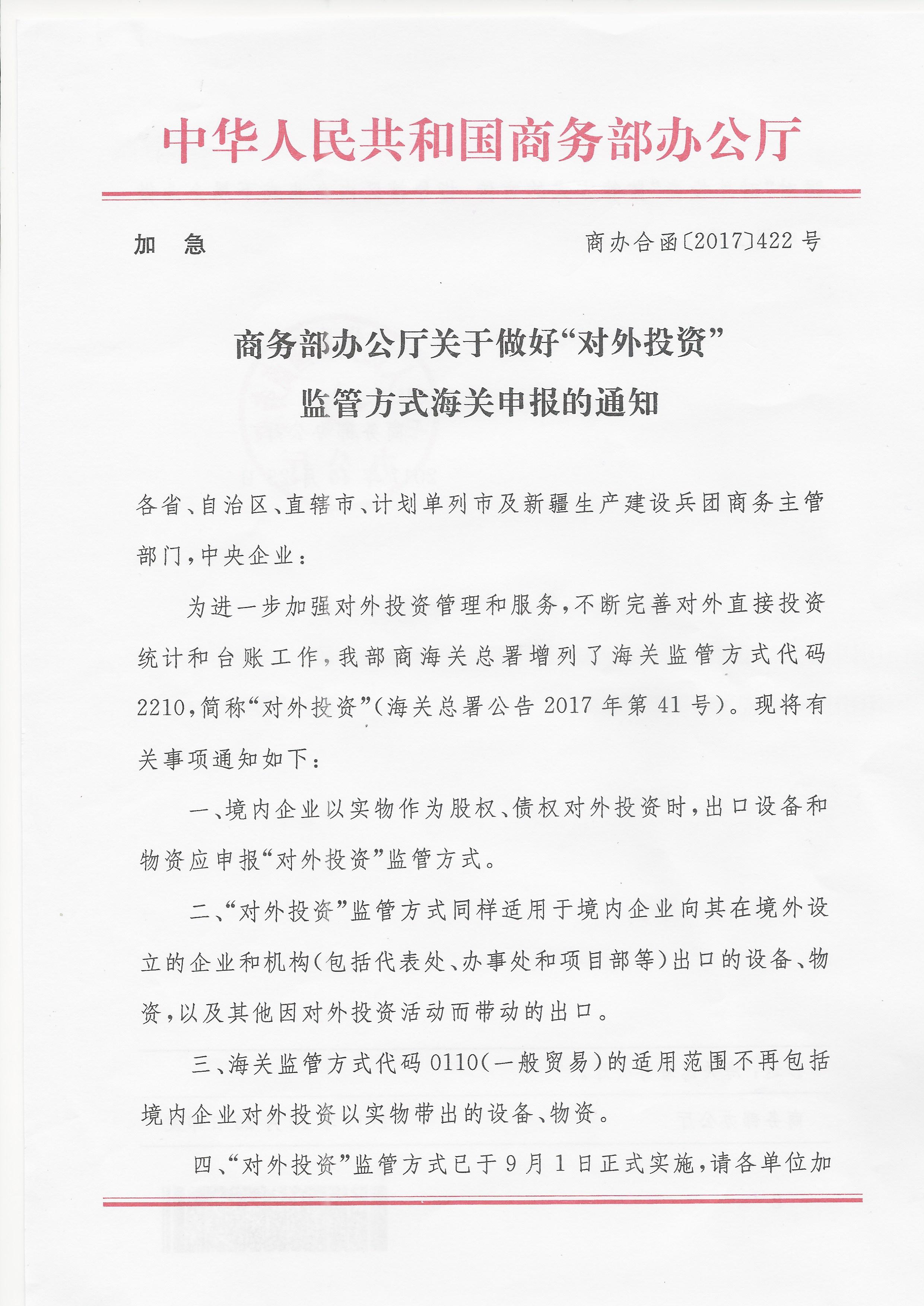 商务部办公厅《关于做好“对外投资”监管方式海关申报的通知》