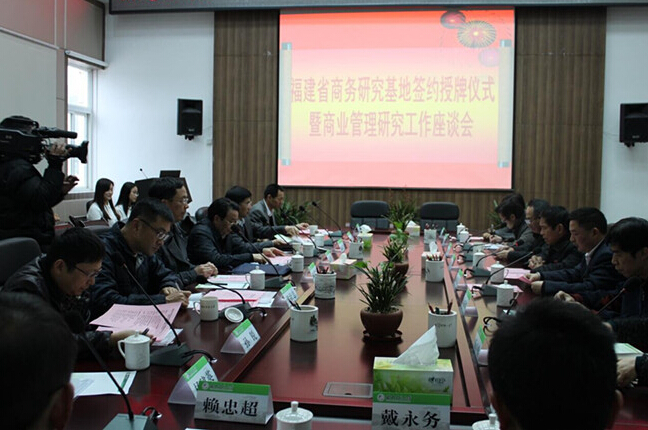 2015年2月2日下午,福建省商务研究基地“海峡商业管理研究中心”签约授牌仪式暨商业管理研究工作座谈会在我校举行。省商务厅副厅长吴秉成、副校长林文雄、宁德师范学院副院长魏远竹,新华都董事长兼省连锁经营协会会长周文贵,省商贸业联合会、省连锁经营协会常务副会长杨建英,华侨大学工商管理学院院长孙锐,省商务厅有关处室负责人,中心骨干专家、教师代表、学校有关部门和学院负责人参加了会议。