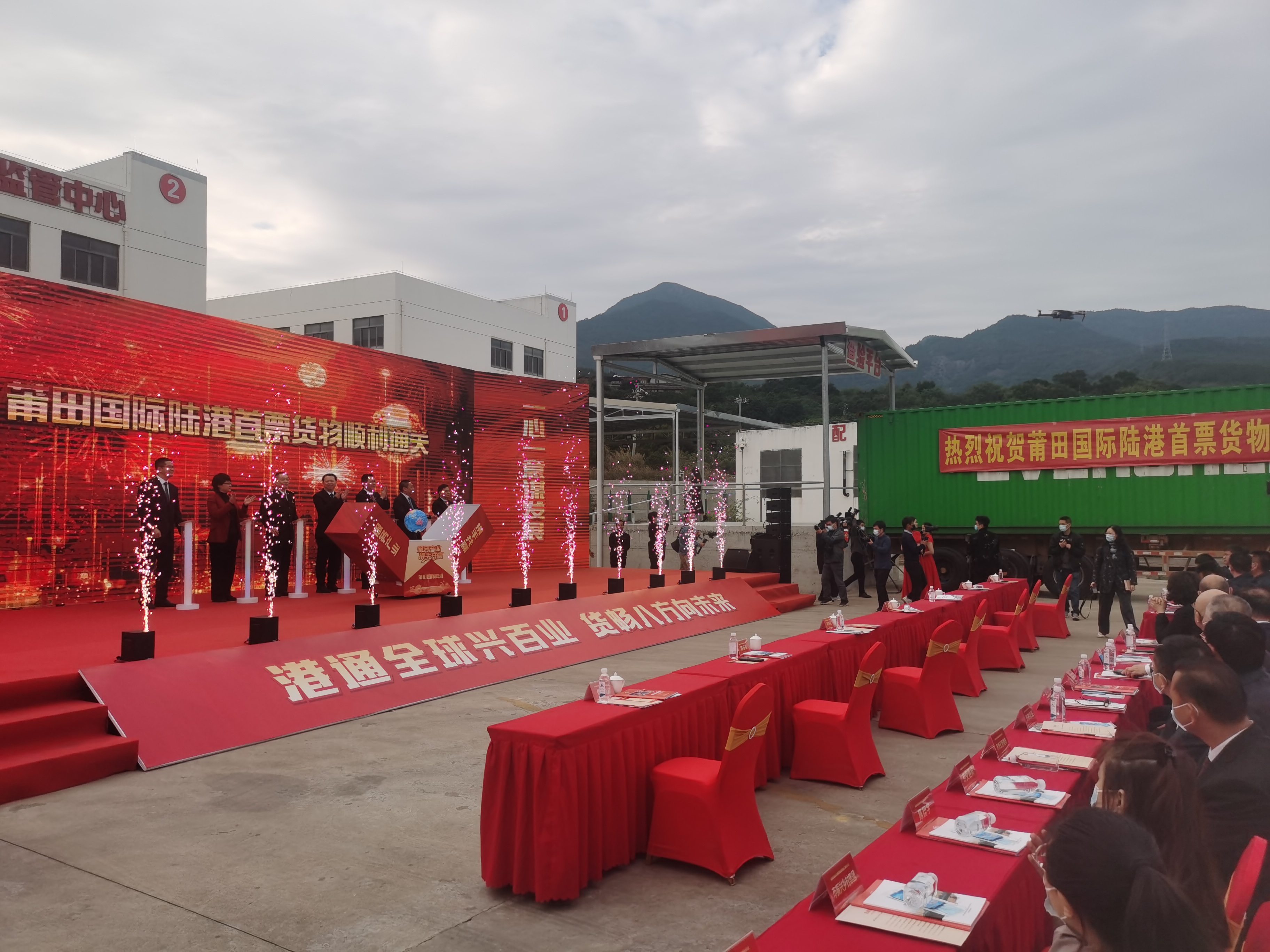 12月12日下午,莆田国际陆港揭牌暨首票出口通关仪式在莆田市跨境电商监管中心举行。福建省商务厅厅长、口岸办主任黄河明出席活动,与莆田市人民政府市长林旭阳、福州海关副关长林跃飞、省港口集团总经理陈乐章等领导嘉宾共同揭牌,见证首票货物出口通关。莆田市外贸、电商、物流企业代表及相关行业商协会代表参加。首票货物顺利出口通关标志着莆田国际陆港正式运行。