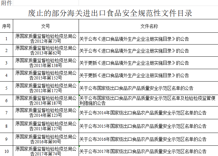 根据工作需要,海关总署决定废止部分进出口食品类规范性文件,具体文件目录见附件。本公告自发布之日起生效。