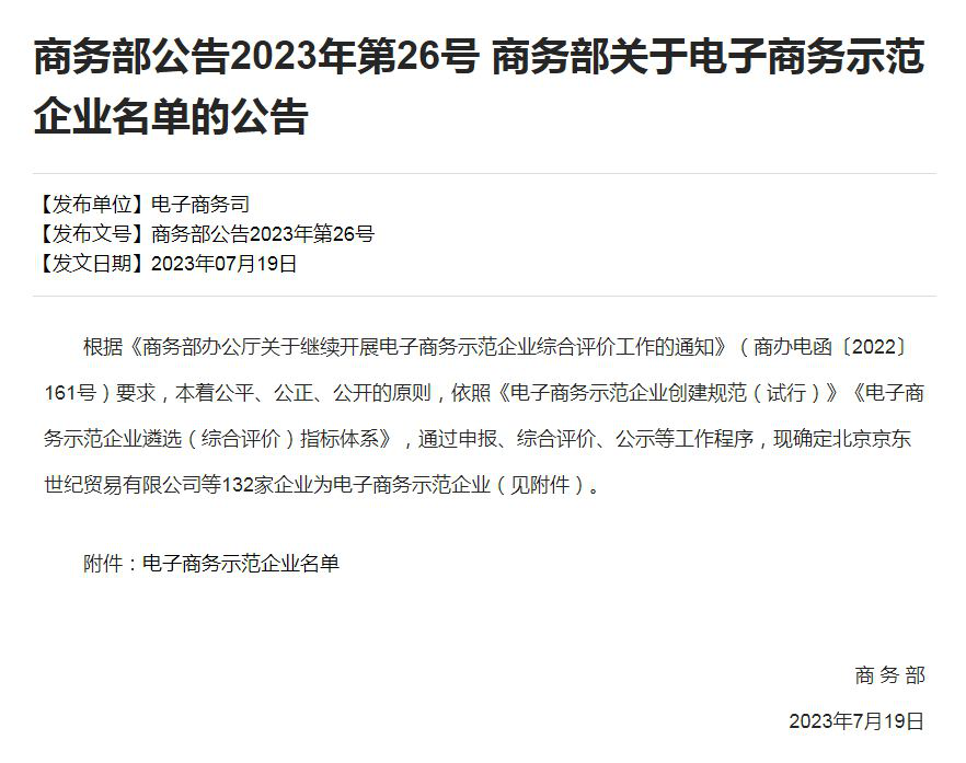 根据《商务部办公厅关于继续开展电子商务示范企业综合评价工作的通知》(商办电函〔2022〕161号)要求,本着公平、公正、公开的原则,依照《电子商务示范企业创建规范(试行)》《电子商务示范企业遴选(综合评价)指标体系》,通过申报、综合评价、公示等工作程序,现确定北京京东世纪贸易有限公司等132家企业为电子商务示范企业。