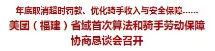 日前,美团(福建)省域首次算法和骑手劳动保障协商恳谈会在省总工会举行,升级安全保障、完善防疲劳机制、取消超时扣款、解决“最后一百米”交付难题等方面取得突破性成果。