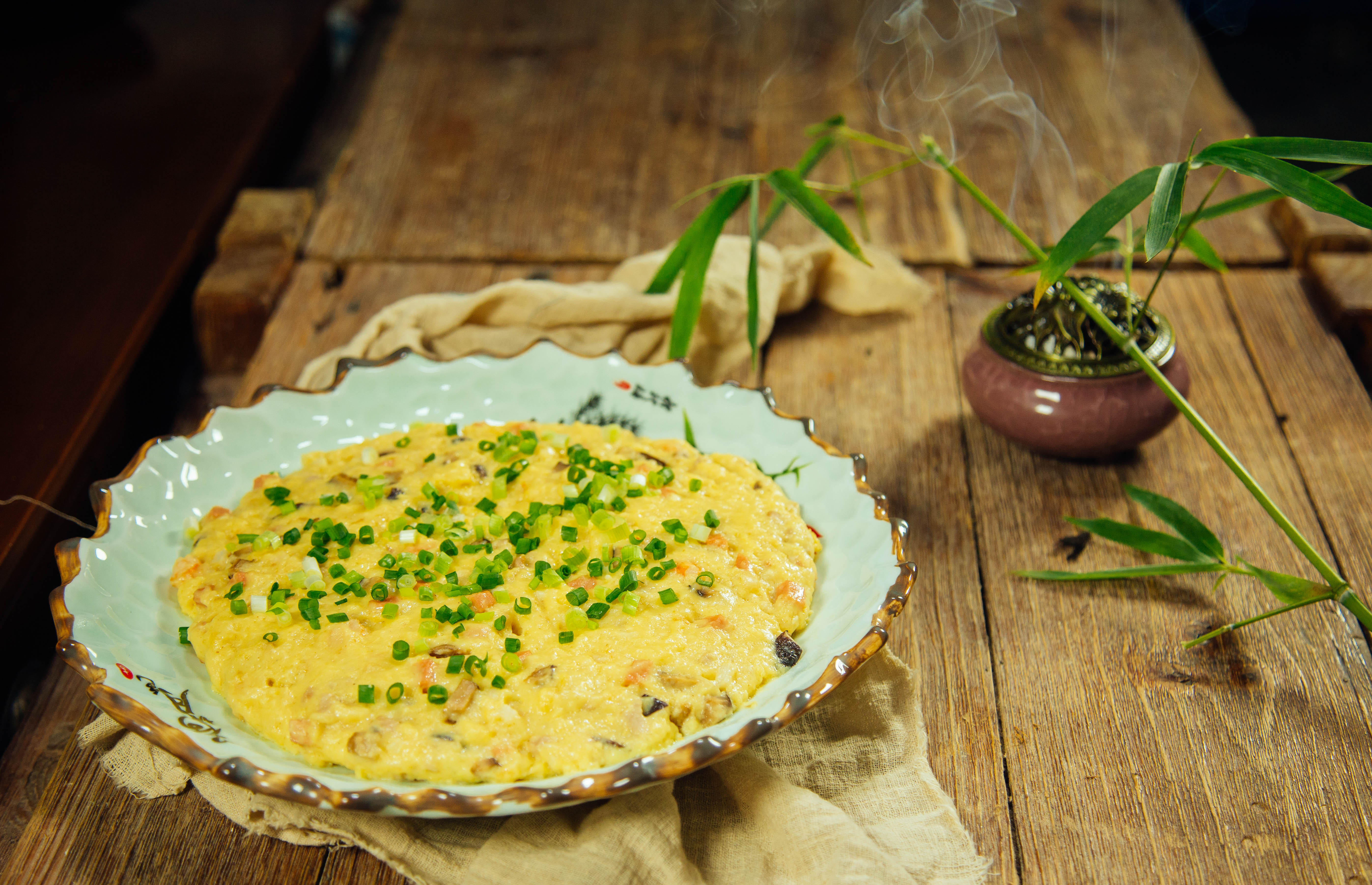 【菜肴食材】 鸡蛋5个、水发冬菇25克、水发干贝25克、火腿25克、鲜虾仁25克、瘦肉25克、熟净冬笋25克、葱2根、精盐3克、料酒3克、胡椒粉2克、花生油75克、地瓜粉180克、高汤600克。