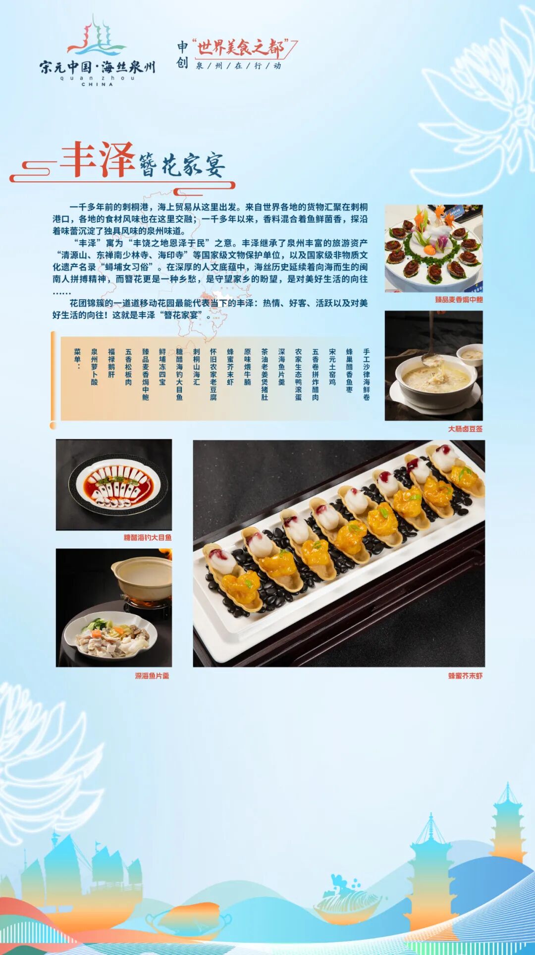 “刺桐宴”以泉州古城发展演变的时间为轴,集中原文化、闽越文化、海洋文化、南洋文化为一体,体现泉州古城作为宋元中国的世界海洋商贸中心的辉煌和魅力。