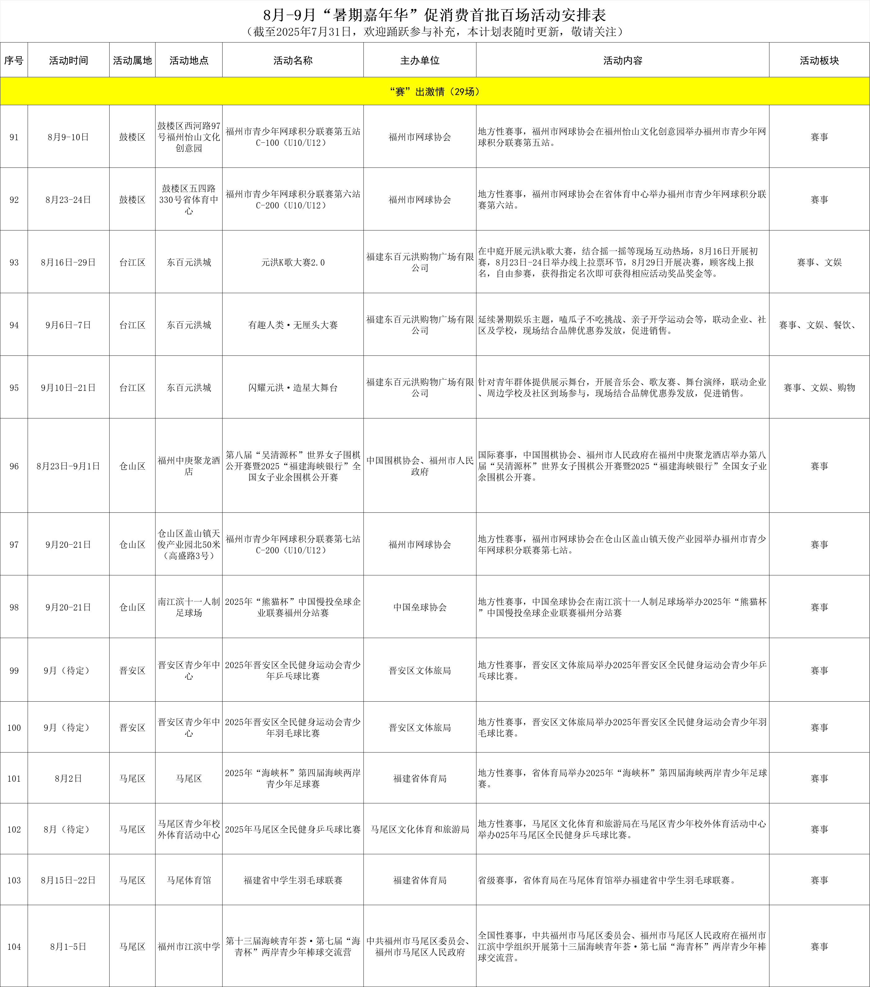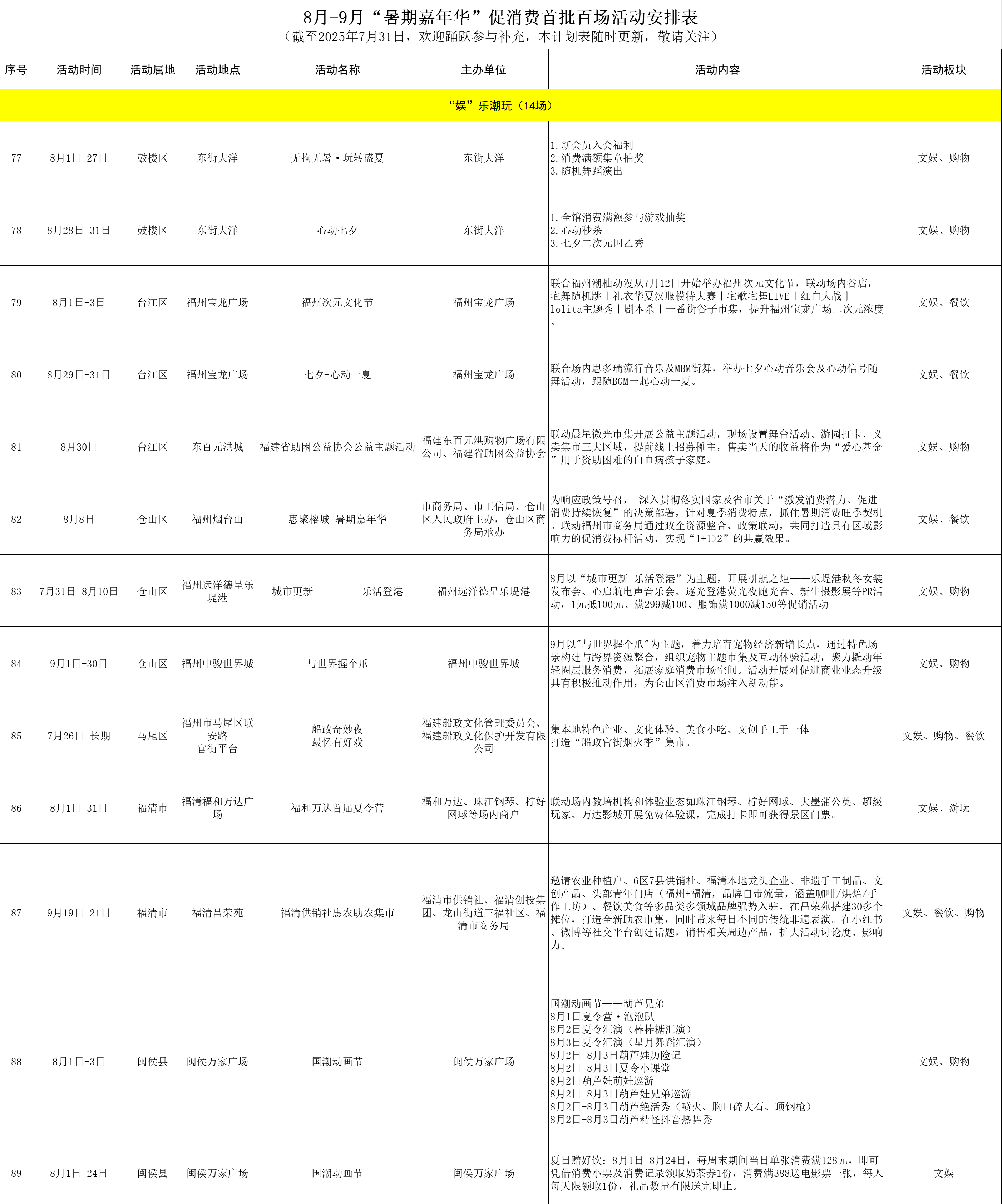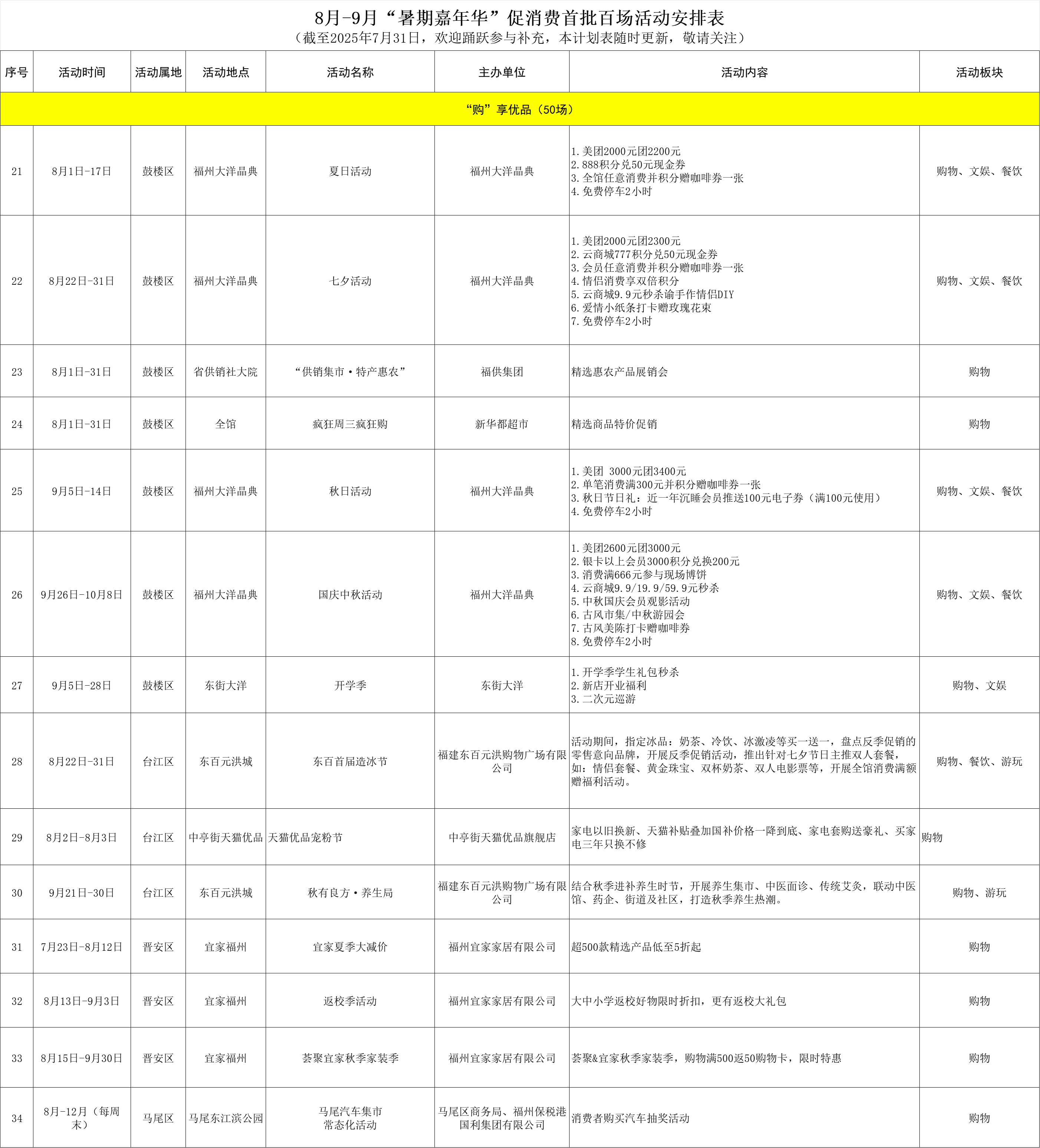 各板块将深度结合福州本地特色与资源优势,推出一系列丰富多彩的活动内容。从知名餐饮企业、老字号品牌和特色小吃店的强强联合,到各大商圈、购物中心纷纷打折让利、满额赠礼、品牌日及会员日等促销活动轮番登场;再到灯光秀、音乐喷泉、街头艺术表演、文创市集、非遗体验等特色夜间文旅项目的一一呈现,还有一系列潮玩演艺活动为市民游客提供丰富的娱乐选择,以及各县市区的体育馆、运动公园举办的各类体育赛事和健身活动,都为市民游客打造全域联动、亮点纷呈的暑期消费狂欢。
