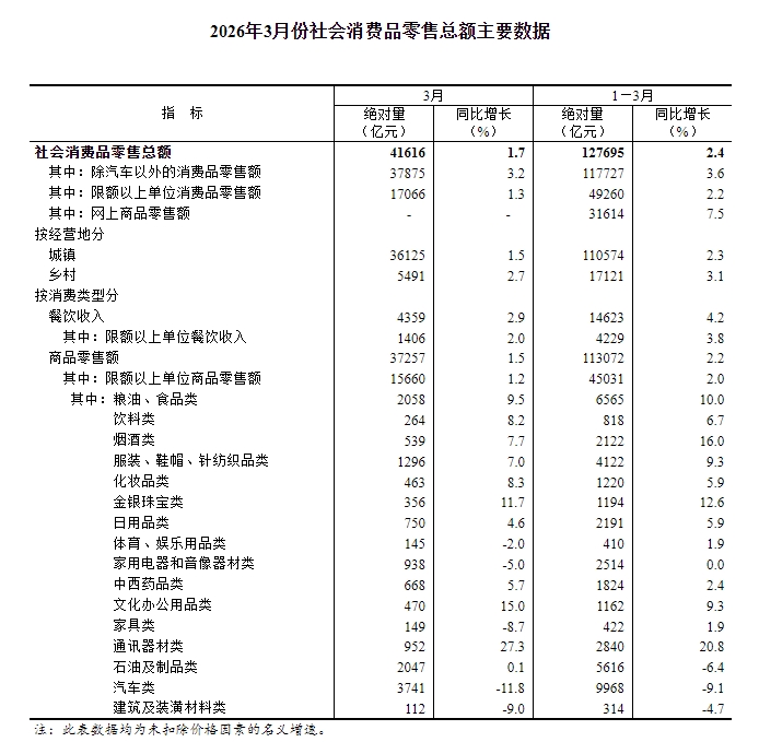 3月份,社会消费品零售总额41616亿元,同比增长1.7%。其中,除汽车以外的消费品零售额37875亿元,增长3.2%。1—3月份,社会消费品零售总额127695亿元,同比增长2.4%。其中,除汽车以外的消费品零售额117727亿元,增长3.6%。