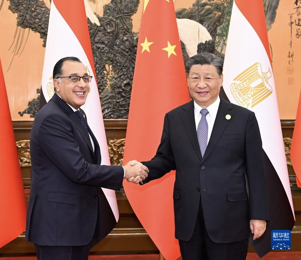 2023年10月19日上午,国家主席习近平在人民大会堂会见来华出席第三届“一带一路”国际合作高峰论坛的埃及总理马德布利。