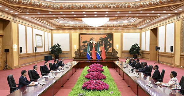 习近平指出,今年是中南建交25周年,两国关系步入“黄金时代”。今年8月,我对南非进行了第四次国事访问,同拉马福萨总统一致决定,中南两国要做高度互信的战略伙伴、共同进步的发展伙伴、相知相亲的友好伙伴、维护正义的全球伙伴。中方愿同南非一道,不断充实中南全面战略伙伴关系内涵,推动两国关系再上新台阶。