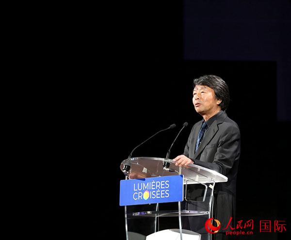 联合国教科文组织前总干事阿祖莱为演讲嘉宾颁奖。人民网记者 于超凡摄