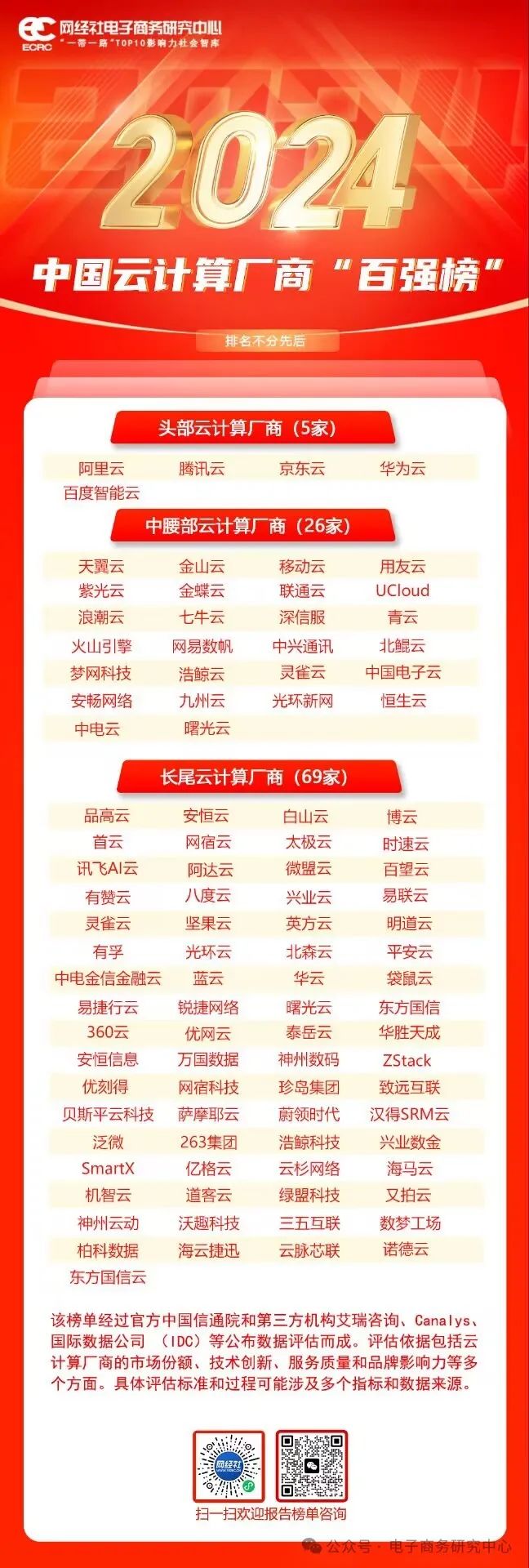 2月13日,《2024年中国云计算厂商“百强榜”》 候选名单发布,如今通过征集各方意见、专家评选后正式发布,触达网经社20余个自媒体/短视频平台近百万粉丝、400000+企业库、3000+记者库、20000+投资者库,全面覆盖涉农电商相关的产、学、研、投、媒、政、协、园区专业用户。