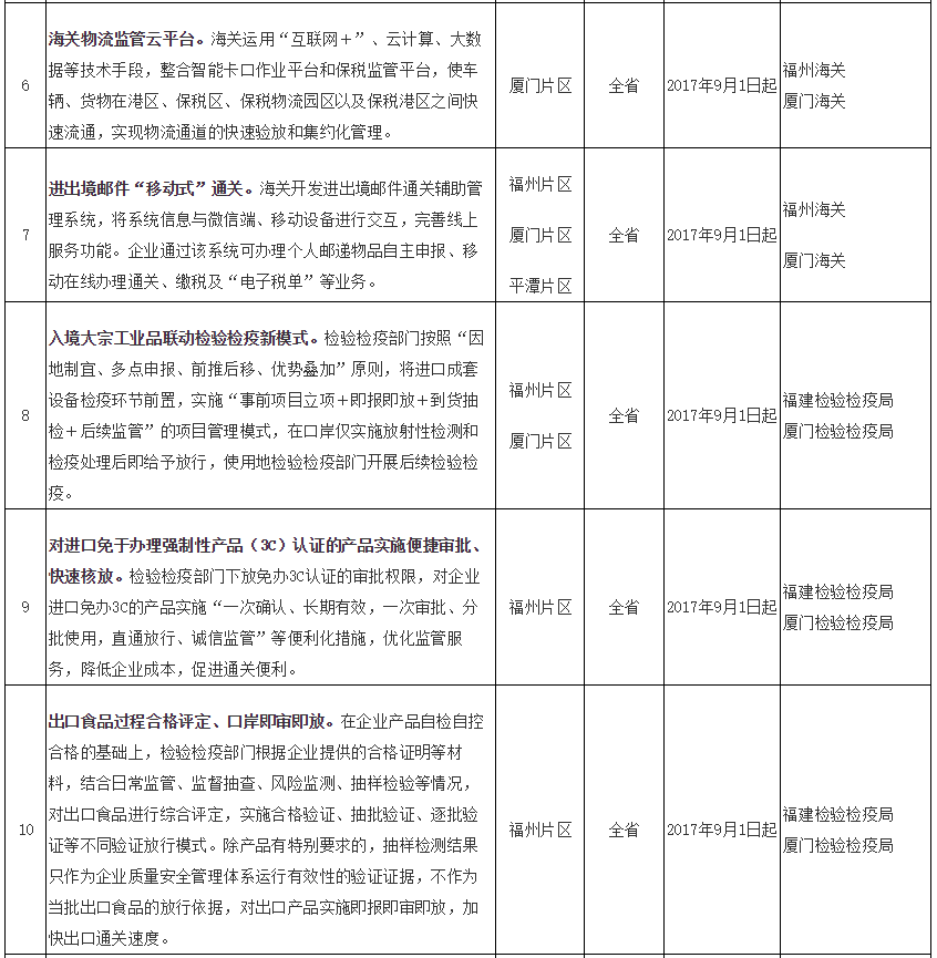 福建自贸试验区第五批创新成果复制推广任务分工表