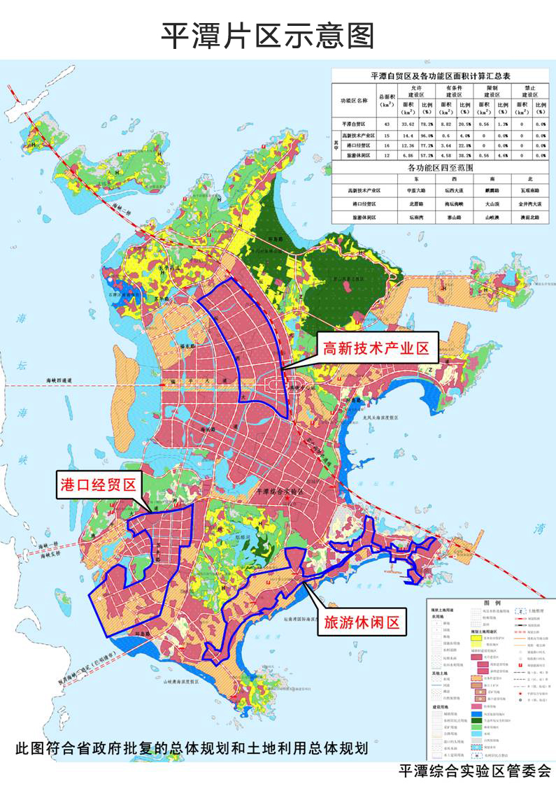 中国(福建)自由贸易试验区平潭片区总面积43平方公里。包括三个区块:港口经贸区16平方公里;高新技术产业区15平方公里;旅游休闲区12平方公里。