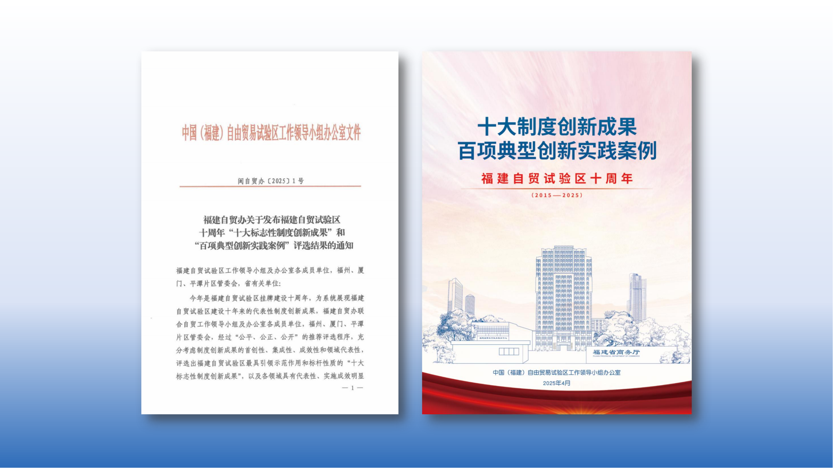 省商务厅(自贸办)发布了十大标志性制度创新成果和百项典型创新实践案例,这些经验成果涵盖了投资、贸易、商事、航运、金融、人员往来、政务服务、产业发展、法治环境、知识产权和生态环境保护等11个领域,充分展现了福建自贸试验区各级各部门的开放创新精神。