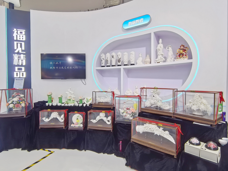 在“福见精品”展区,德化白瓷与建阳建盏交相辉映。韵丽陶瓷的瓷花艺术让非遗焕发新姿,华瓷艺术陶瓷将“福文化”融入现代设计,水木间建盏传承人蔡龙大师现场展示非遗技艺建盏作品,传统工艺与现代美学碰撞出璀璨火花。
