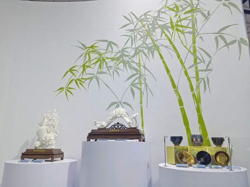 展馆压轴“彩蛋”惊艳全场:德化大师创作的瓷雕薄如蝉翼、透光见影,建盏曜变斑纹在灯光下流转千年光华。
