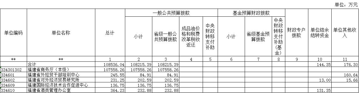 按照综合预算的原则,部门所有收入和支出均纳入部门预算管理。2018年,福建省商务厅部门收入预算为108536.04万元,比上年减少7824.31万元,主要原因是一般公共预算拨款收入比上年减少7927.59万元。其中:一般公共预算拨款108215.39万元,基金预算财政拨款0万元,财政专户拨款0万元,其他收入176.3万元,单位结余结转资金144.35万元。相应安排支出预算108536.04万元,比上年减少7824.31万元,其中:人员支出3943.63万元,对个人和家庭补助支出692万元,公用支出1330.88万元,项目支出102569.53万元。