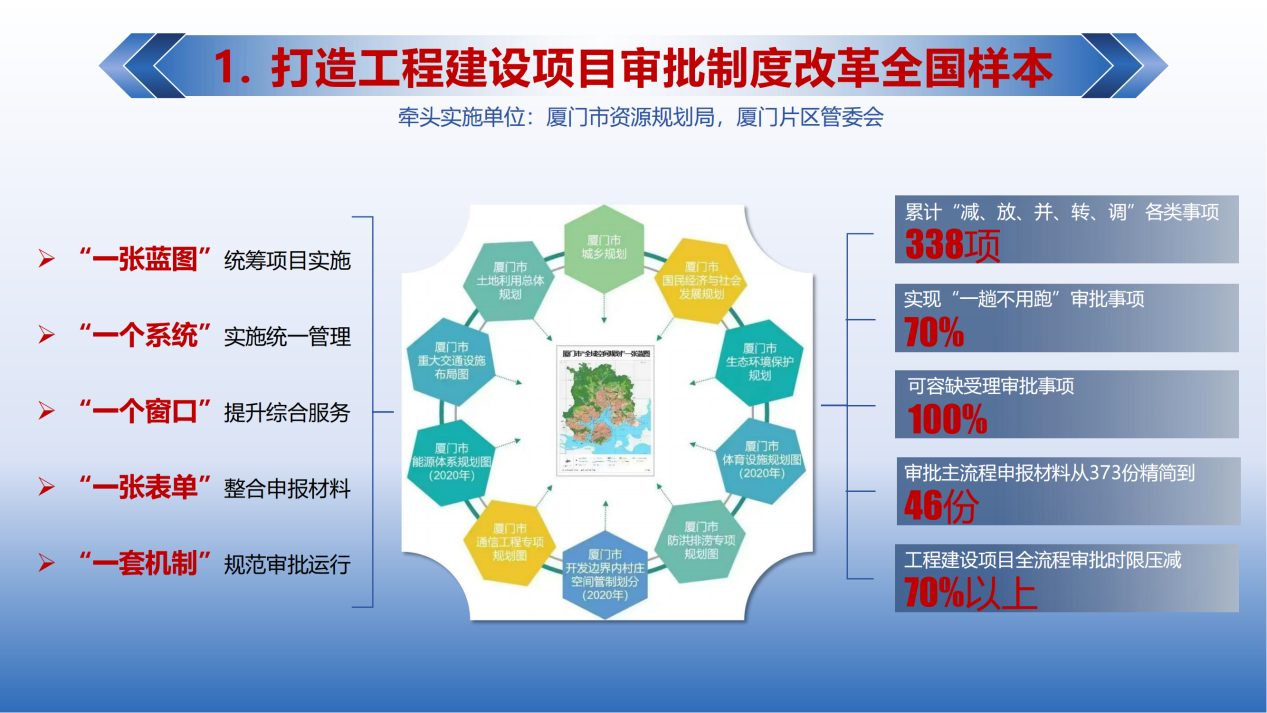 厦门市资源规划局及片区管委会持续推动工程建设项目审批制度改革,通过“一张蓝图”统筹项目实施、“一个系统”实施统一管理、“一个窗口”提升综合服务、“一张表单”整合申报材料、“一套机制”规范审批运行,累计“减、放、并、转、调”工程建设项目审批事项338项,实现70%的审批事项“一趟不用跑”,100%的审批事项可容缺受理,审批主流程申报材料从373份精简到46份,工程建设项目全流程审批时限压减70%以上。