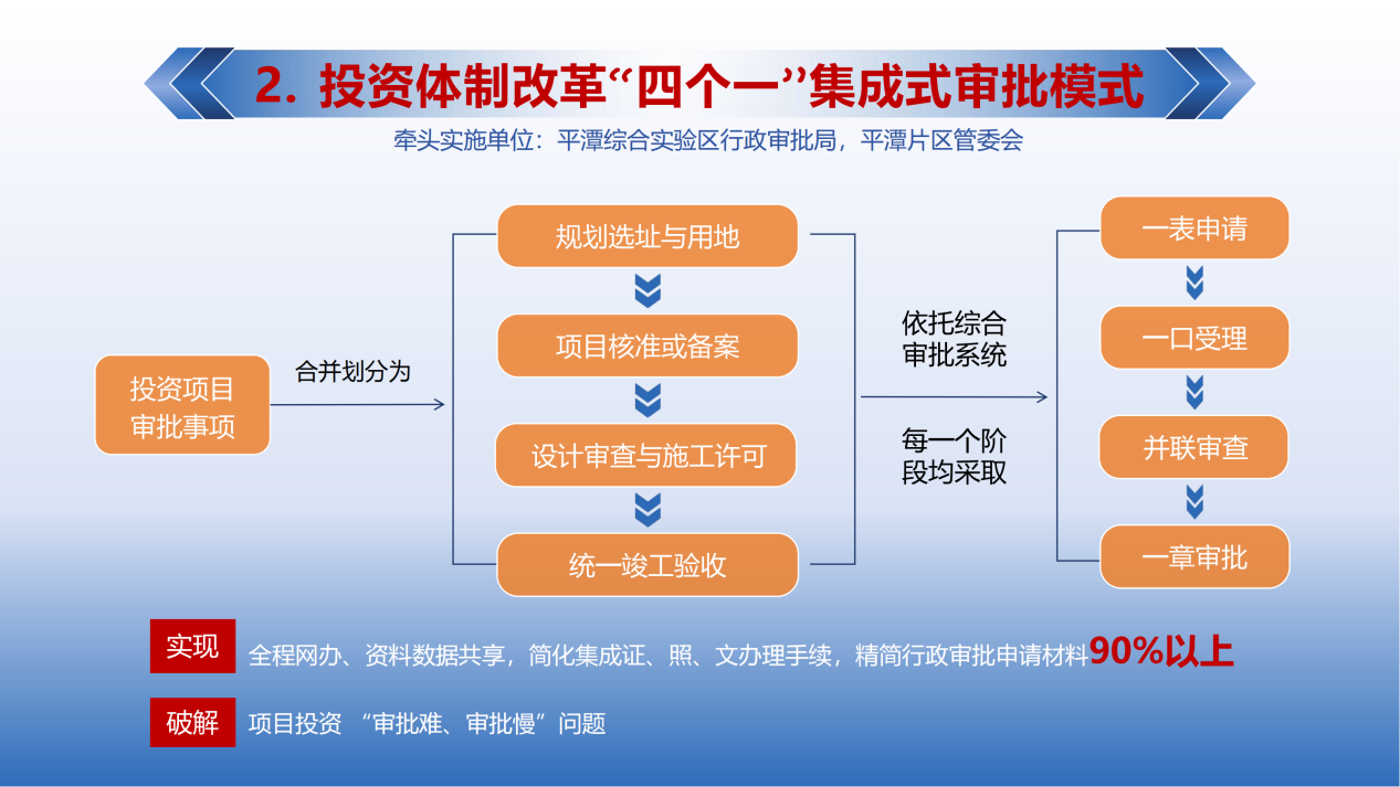 平潭综合实验区行政审批局及片区管委会将投资项目所有审批事项合并为“规划选址与用地、项目核准或备案、设计审查与施工许可、统一竣工验收”四个办理阶段,依托综合审批系统,每一个阶段均采取“一表申请、一口受理、并联审查、一章审批”的综合审批模式,实现全程网办,精简行政审批申请材料90%以上,有力破解项目投资“审批难、审批慢”问题。