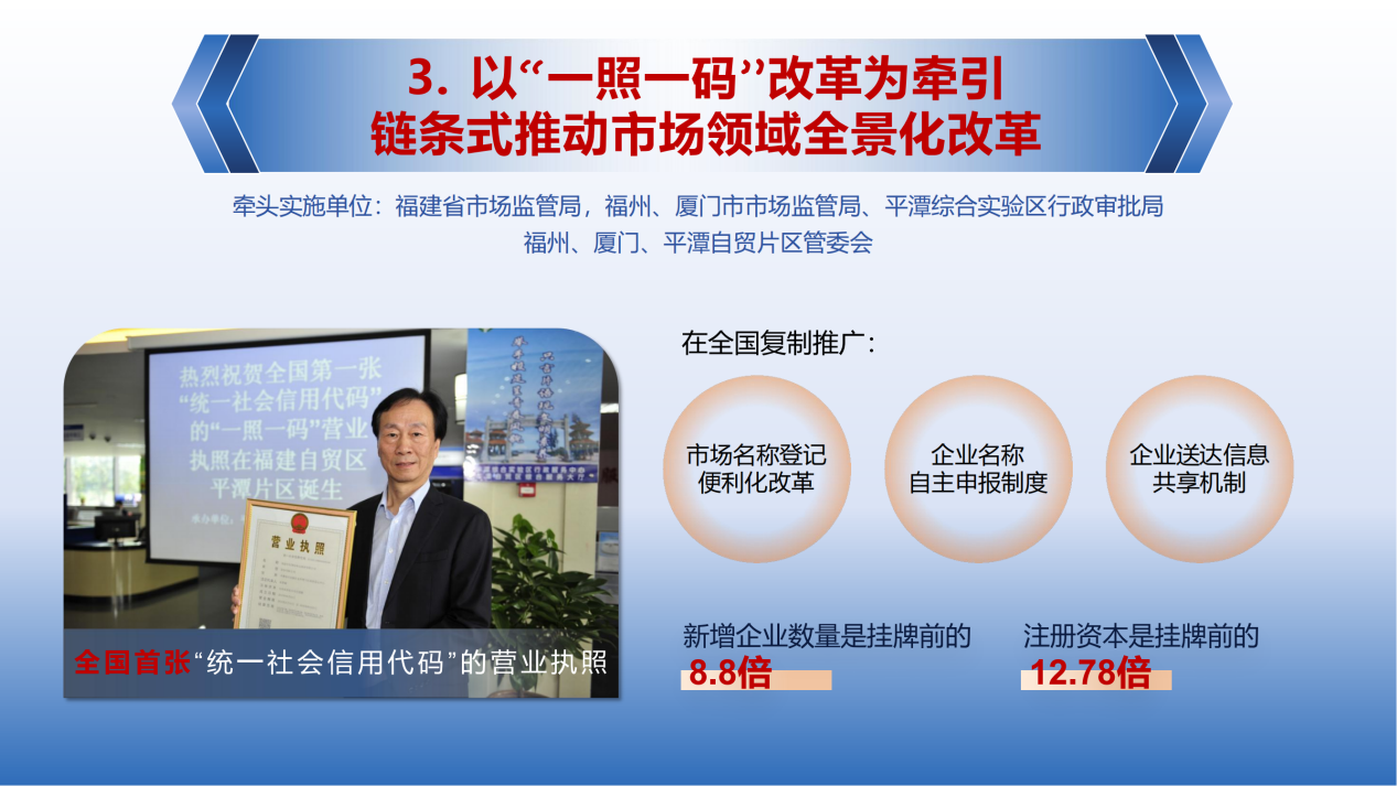 省市场监管局联合相关单位,率先推行“多证合一、一照一码”商事登记模式改革,核发全国首张“统一社会信用代码”营业执照,拓展深化市场主体准入、准营、监管、信用、服务和退出全链条改革,形成市场名称登记便利化改革、企业名称自主申报制度、企业送达信息共享机制等一批在全国复制推广的改革经验。福建自贸试验区挂牌以来新增企业数量及注册资本分别是挂牌前的8.8倍、12.78倍。