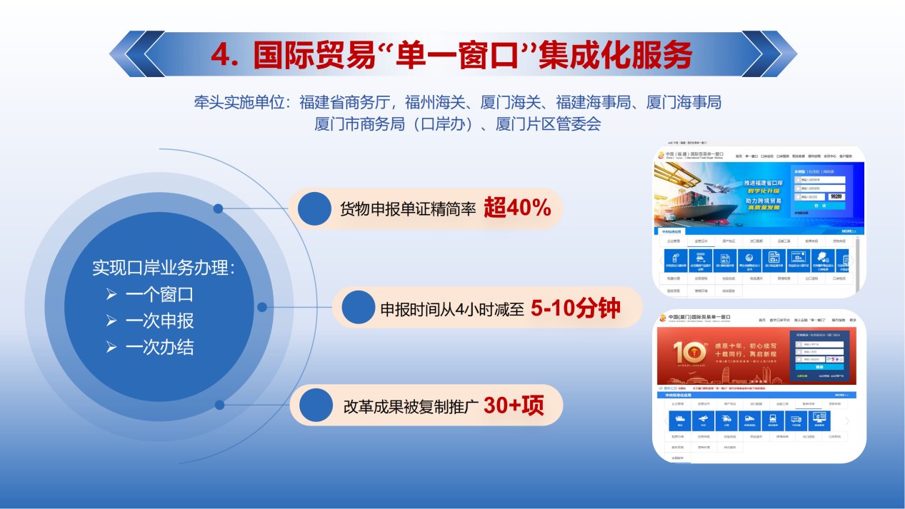 省商务厅联合海关、海事及厦门片区管委会等单位,上线国内首批国际贸易“单一窗口”,通过整合政府、机构、企业数据,提供涵盖通关监管、物流服务、金融服务、政务服务、经贸促进等全链条全流程便利化服务,实现口岸业务办理“一个窗口、一次申报、一次办结”。福建国际贸易“单一窗口”货物申报单证精简率超40%,申报时间从4小时减至5-10分钟;30多项改革成果被复制推广。