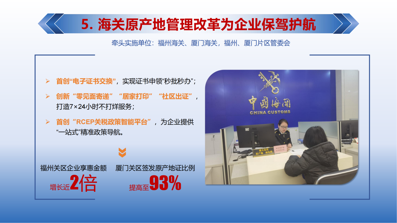 牵头实施单位:福州海关、厦门海关,福州、厦门片区管委会