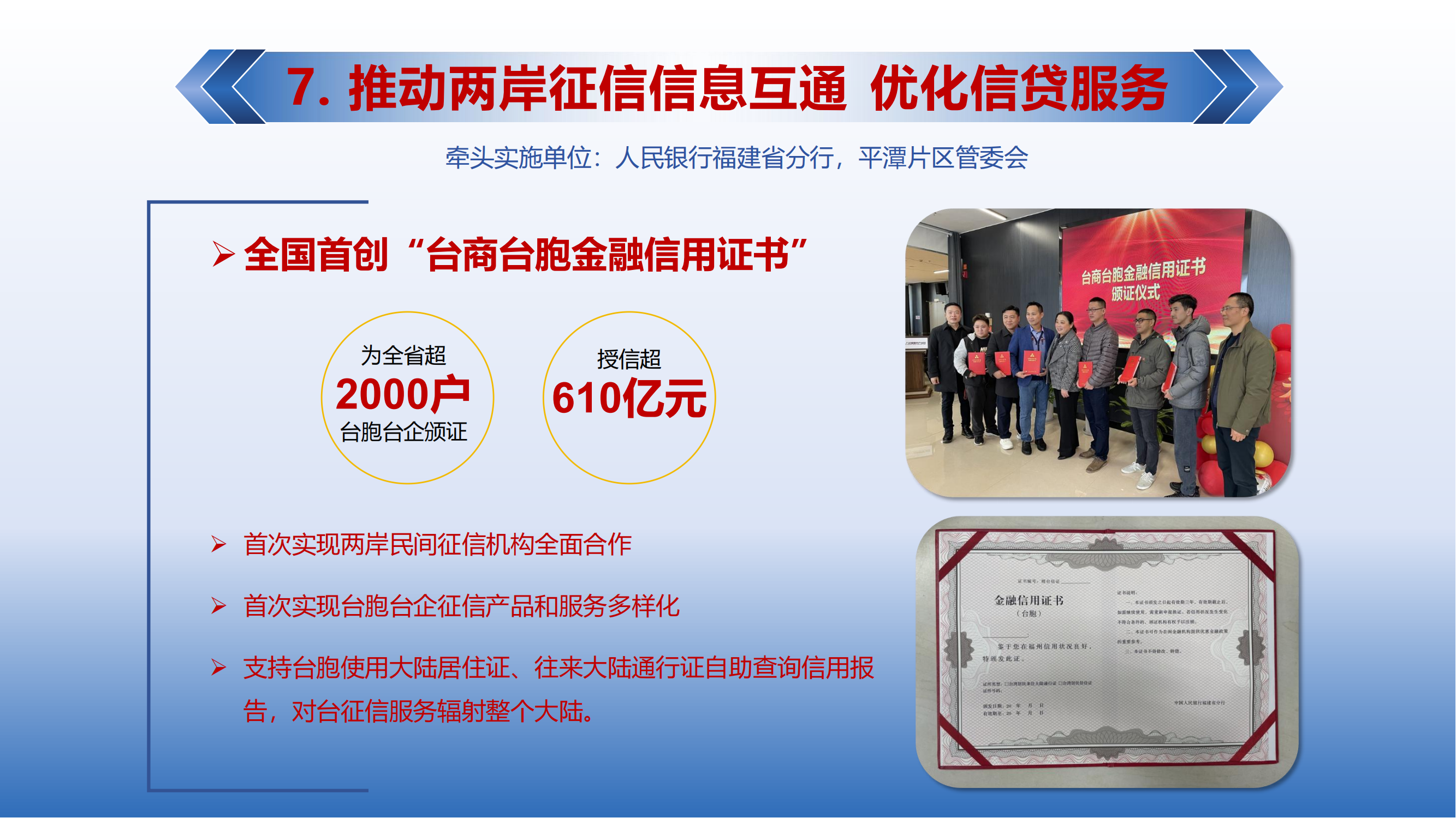 人民银行福建省分行创新体制机制,全国首创“台商台胞金融信用证书”,累计为全省超2000户台胞台企颁证,授信超610亿元。首次实现两岸民间征信机构全面合作,打通两岸信用信息双向流动“堵点”。首次实现台胞台企征信产品和服务多样化,创新推出2大类6个品种的台胞台企信用报告,支持台胞使用大陆居住证、往来大陆通行证自助查询信用报告,对台征信服务辐射整个大陆