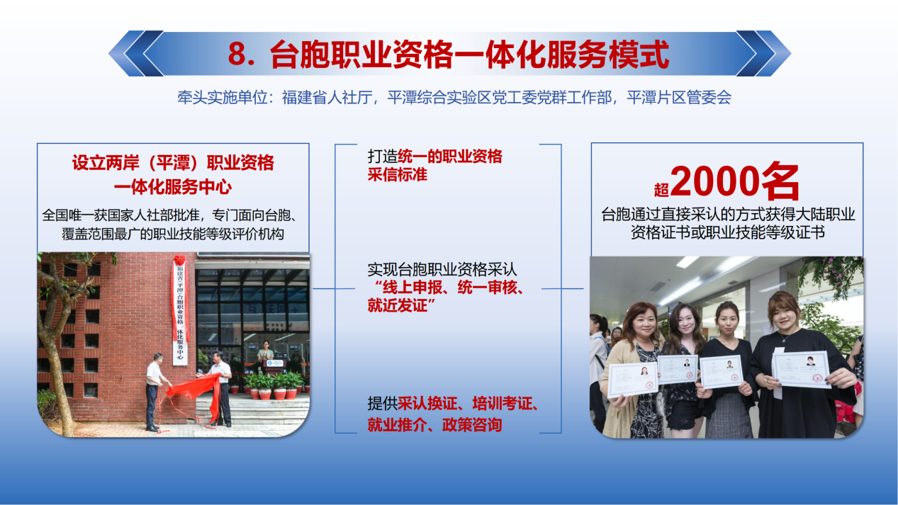 省人社厅、平潭综合实验区在全国率先探索开展两岸职业资格标准比对和证书采认,设立两岸(平潭)职业资格一体化服务中心,打造统一的职业资格采信标准,实现台胞职业资格采认“线上申报、统一审核、就近发证”,提供采认换证、培训考证、就业推介、政策咨询等全链条服务,是全国唯一获国家人社部批准,专门面向台胞、覆盖范围最广的职业技能等级评价机构,已有超2000名台胞通过直接采认的方式获得大陆职业资格证书或职业技能等级证书。