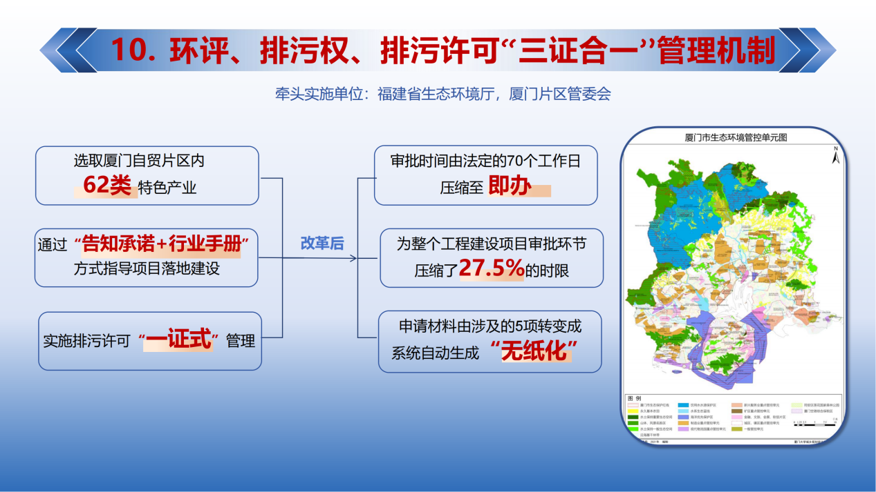 省生态环境厅指导厦门市生态环境局,聚焦工程建设领域项目环评审批时间长、落地慢等痛点,选取厦门自贸片区内62类特色产业,允许通过“告知承诺+行业手册”方式指导项目落地建设,并依托厦门市生态环境分区管控应用系统,实施排污许可“一证式”管理。改革后,审批时间由法定的70个工作日压缩至即办,为整个工程建设项目审批环节压缩了27.5%的时限,申请材料由涉及的5项转变成系统自动生成“无纸化”,实现“一证统管”。