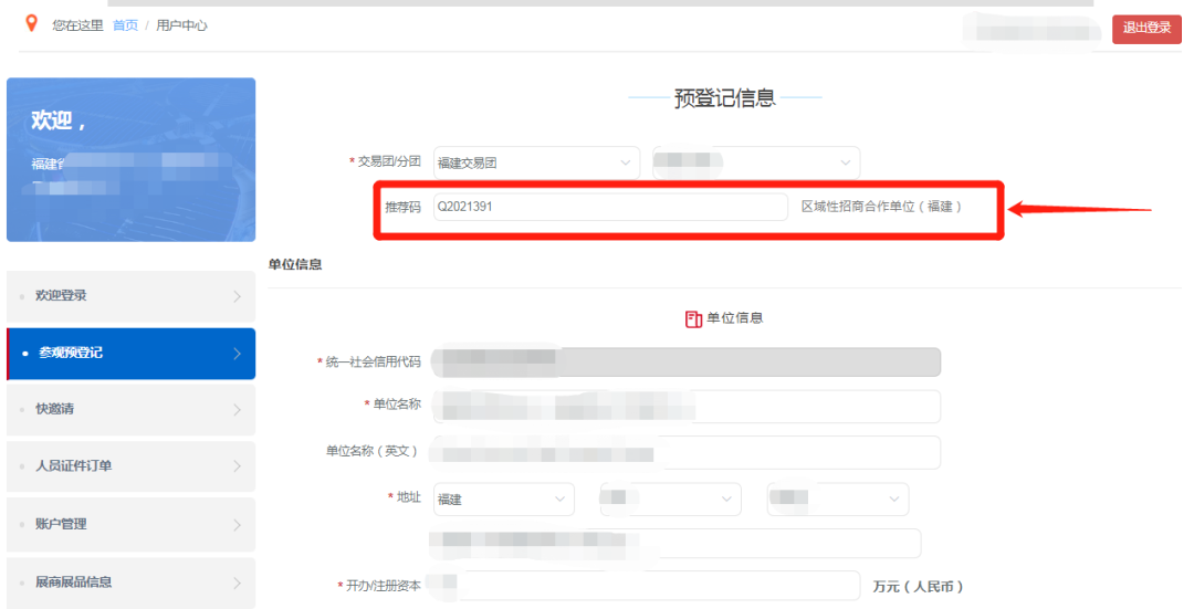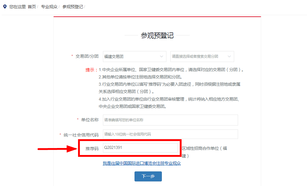 参会单位或个人对所填报的单位和个人注册信息的真实性负责,请谨慎填报。所有报名单位按照属地或隶属关系选择加入交易团,属地为福建省的专业观众,在登记参观预登记信息时请填写推荐码Q2021391。