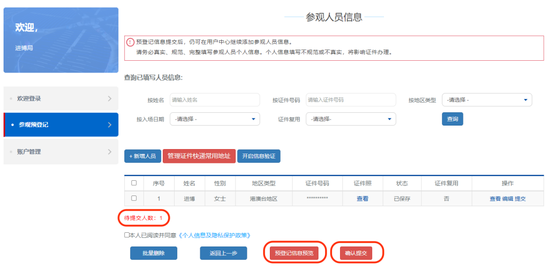 填写单位信息、联系人信息、上传单位资质证明、填写办证人员信息,确认无误后点击“提交”。