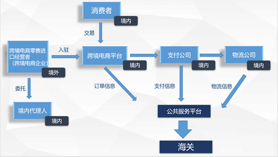 在跨境电商进口中,跨境电商平台及支付、物流企业分别向监管部门实时传输施加电子签名的跨境电商零售进口交易、支付、物流电子信息。为了实现“三单”信息的联网传输,保证对这些主体的有效监管及信息的真实性,跨境电商平台、支付企业、物流企业,也必须为境内注册公司。