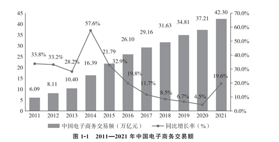 2021年,全国电子商务交易额达42.3万亿元,同比增长19.6%(由于统计口径调整,同比增速数据按可比口径计算)。