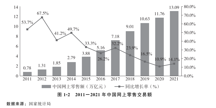 国家统计局数据显示,2021年,全国网上零售额达13.09万亿元,同比增长14.1%。实物商品网上零售额10.8万亿元,增长12.0%,占社会消费品零售总额的比重为24.5%。