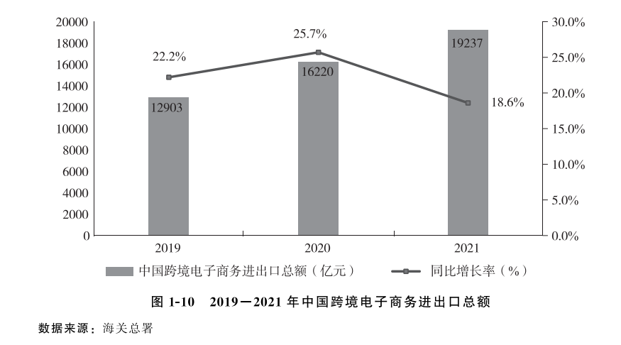 海关统计调查显示,2021年我国跨境电商进出口规模约1.92万亿元,同比增长18.6%,占进出口总额的4.9%。