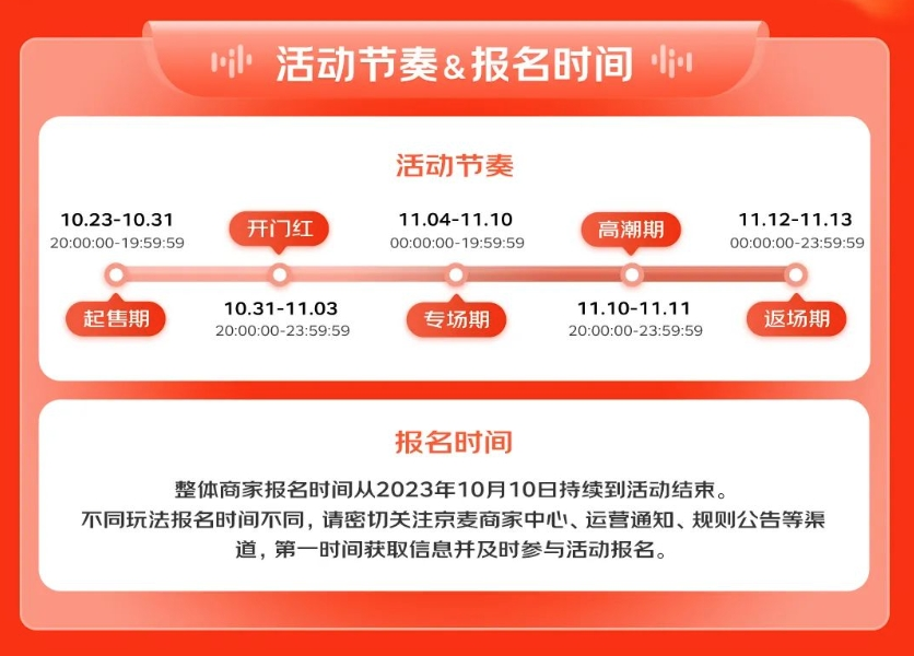 整体来看,本次双11,京东将围绕“起售期、开门红、专场期、高潮期、返场期”五个时期重点布局营销玩法,时间跨度一个月,从10月23日开始,至11月13日结束。