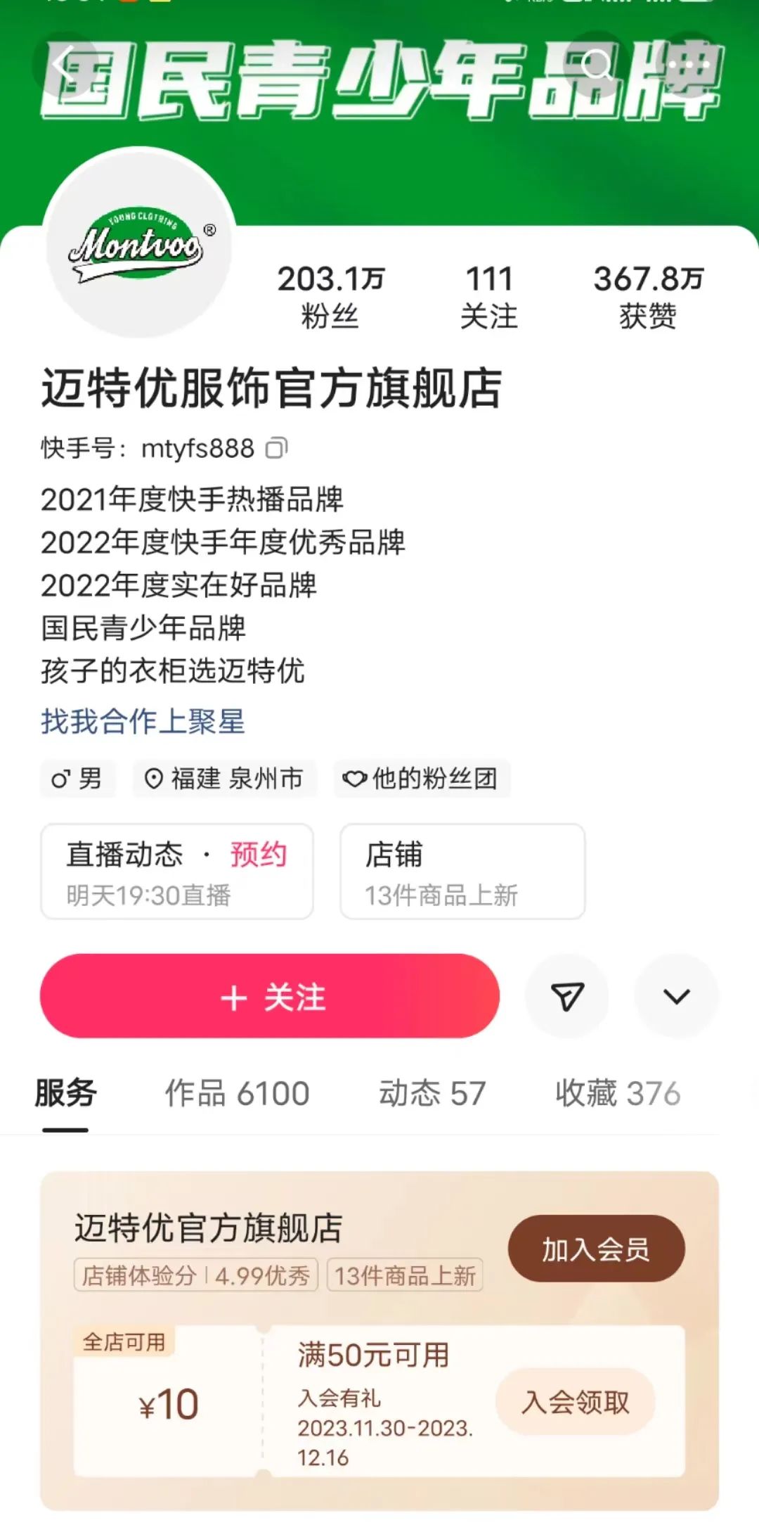 快手平台福建石狮男装标杆商家,快手双11期间GMV位列快手男装品牌店铺第一名,双11当天GMV突破250万。迈特优有自己的开发、设计、生产团队,为平台客户提供全品类的高性价比商品。货品主打青少年男装风格,多为母亲给孩子进行挑选搭配,女性消费者占比超过90%。