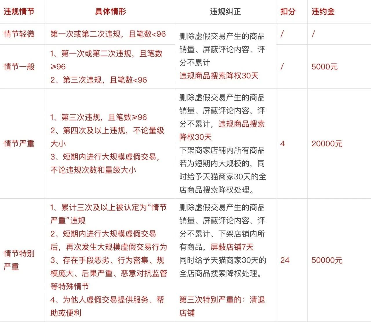 根据新规,天猫将根据商家的违规情节和刷单笔数进行不同程度的处罚。