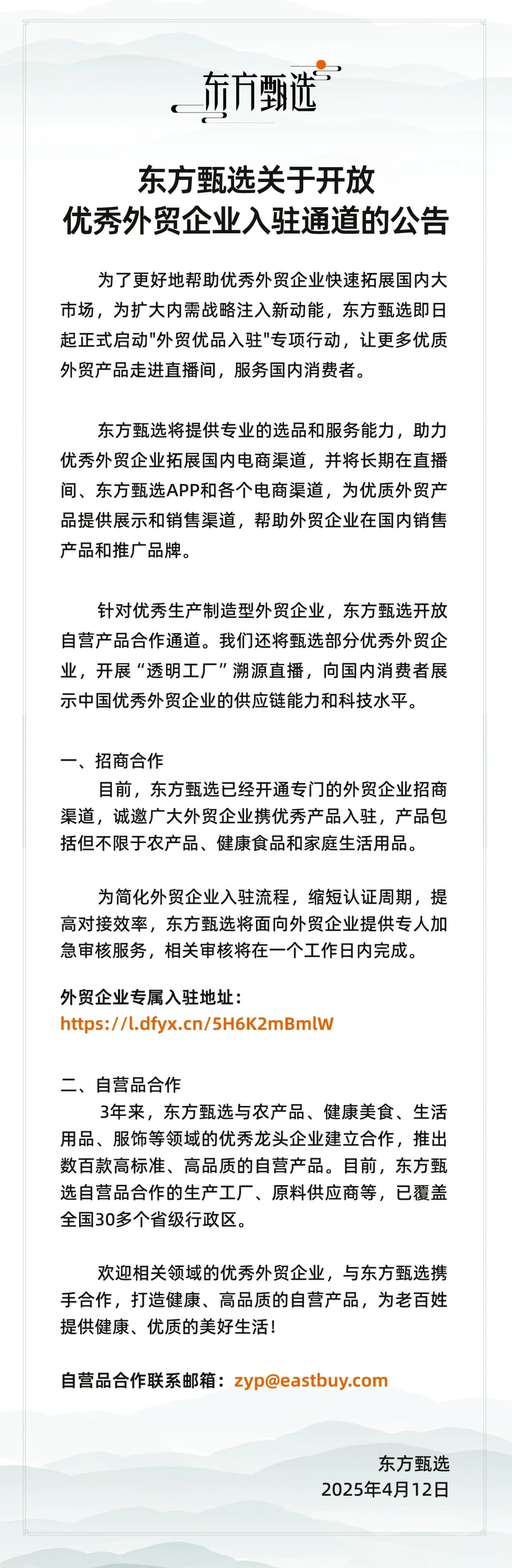为了更好地帮助优秀外贸企业快速拓展国内大市场,为扩大内需战略注入新动能,东方甄选即日起正式启动"外贸优品入驻"专项行动,让更多优质外贸产品走进直播间,服务国内消费者。