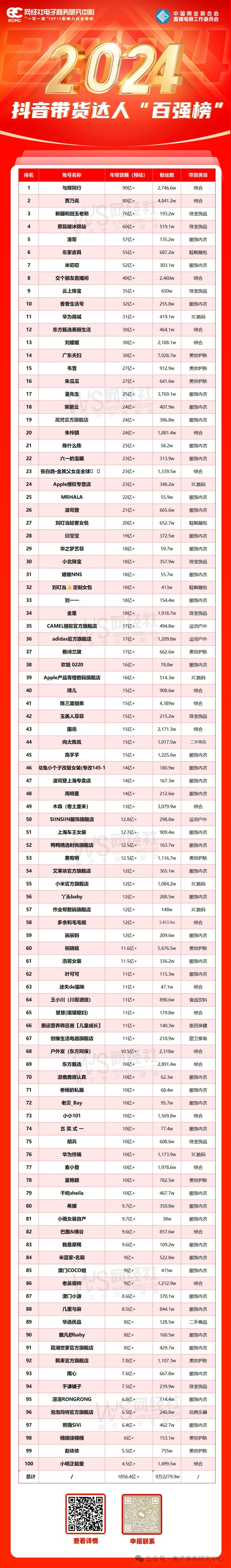 这100家带货达人总销售额超1856.4亿,总粉丝量达9万2279.9w。网经社根据销售额及粉丝量,将《2024年抖音带货达人“百强榜”》中涉及的主播达人分为三大梯队,分别是:“超头部达人”、“头部达人”及“肩部达人”。