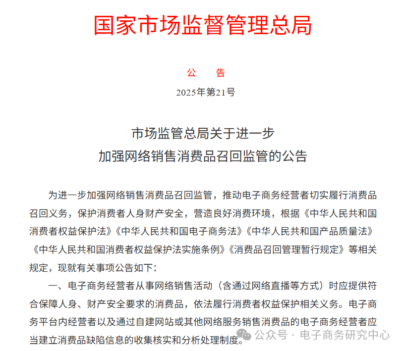 此背景下,国家市场监督管理总局于 2025 年 6 月 12 日发布《关于进一步加强网络销售消费品召回监管的公告》(以下简称《公告》),以系统性制度设计破解线上消费安全困局,标志着我国消费品召回监管从传统线下模式向全渠道、全链条数字化治理的跃升。