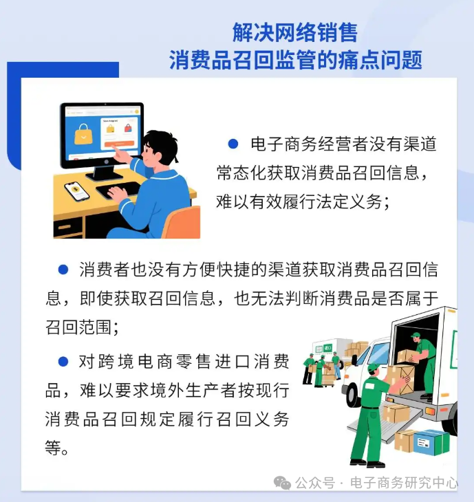 针对这些痛点,《公告》的出台具有鲜明的现实针对性。市场监管总局新闻发言人王秋苹指出,网络交易在带来便利的同时,也使 “平台经营者召回信息获取不畅、履责困难,消费者召回信息获取渠道有限、自主判定能力不足,跨境商品召回更是面临境外主体配合度低、落地难的困境”。