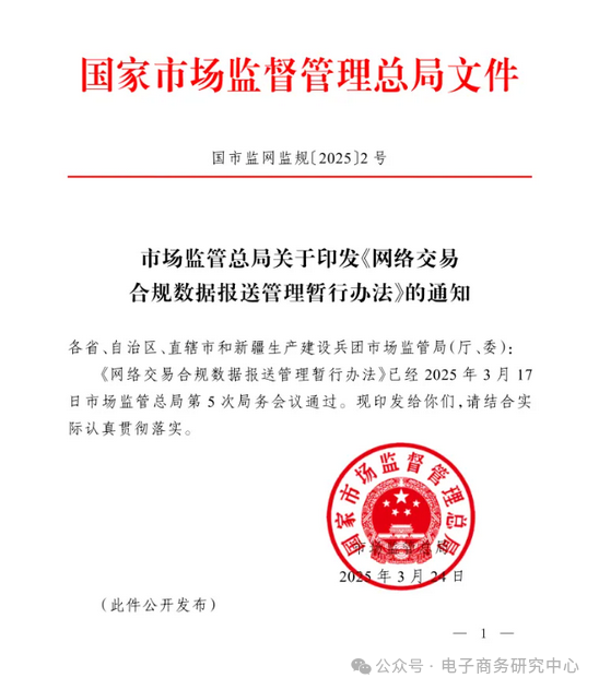 一、市监总局印发《网络交易合规数据报送管理暂行办法》:规范电商网络交易合规数据报送行为