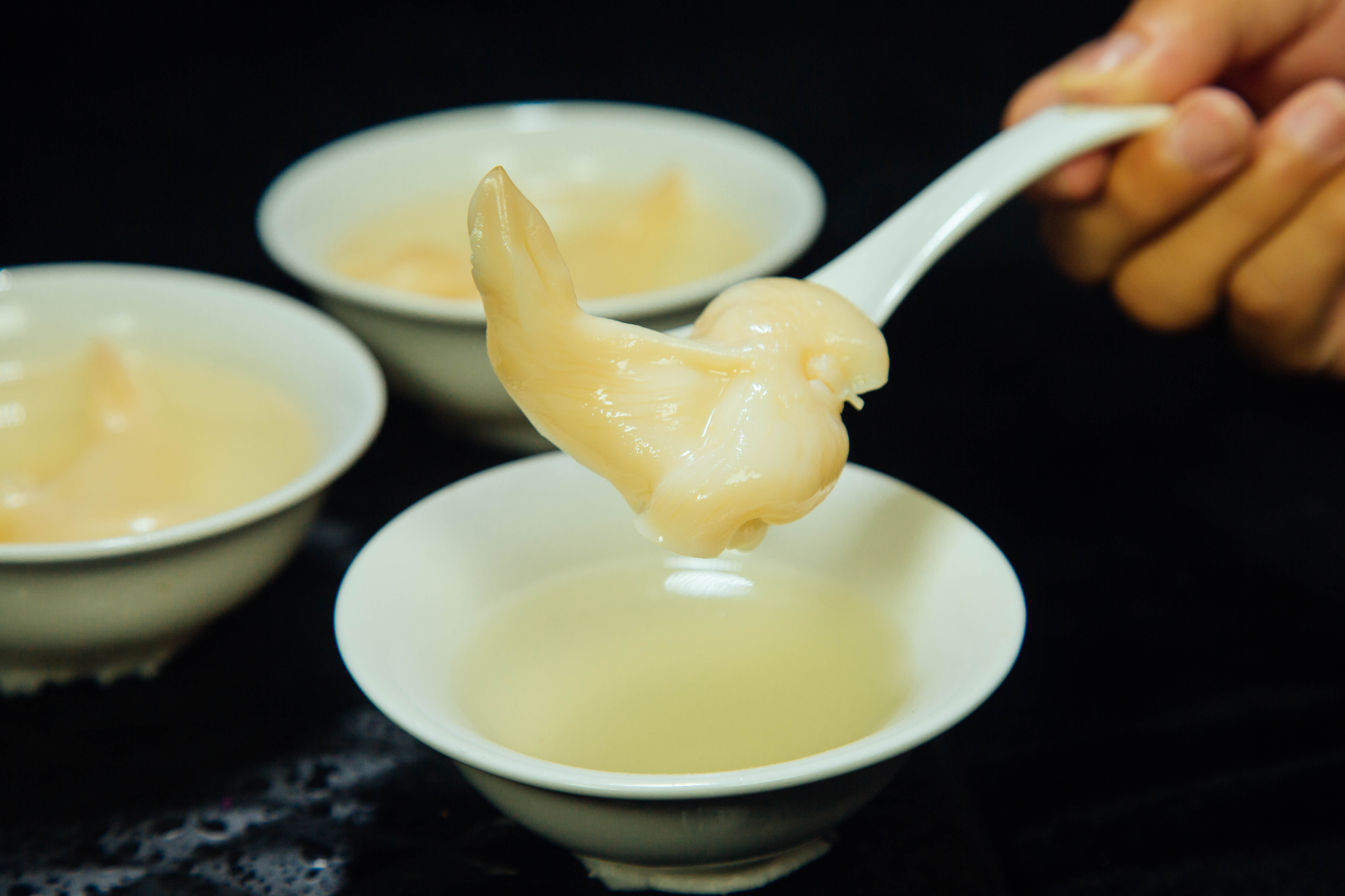 3.将蚌尖、蚌裙、蚌纽装在漏勺里,放入沸水锅中氽至五成熟,剔净蚌膜,加绍酒抓匀腌渍后沥干酒汁。将蚌裙、蚌纽排在碗底,上面铺上蚌肉,然后把鸡汤烧沸,调入白酱油、味精后浇入汤碗中的蚌肉上即成。