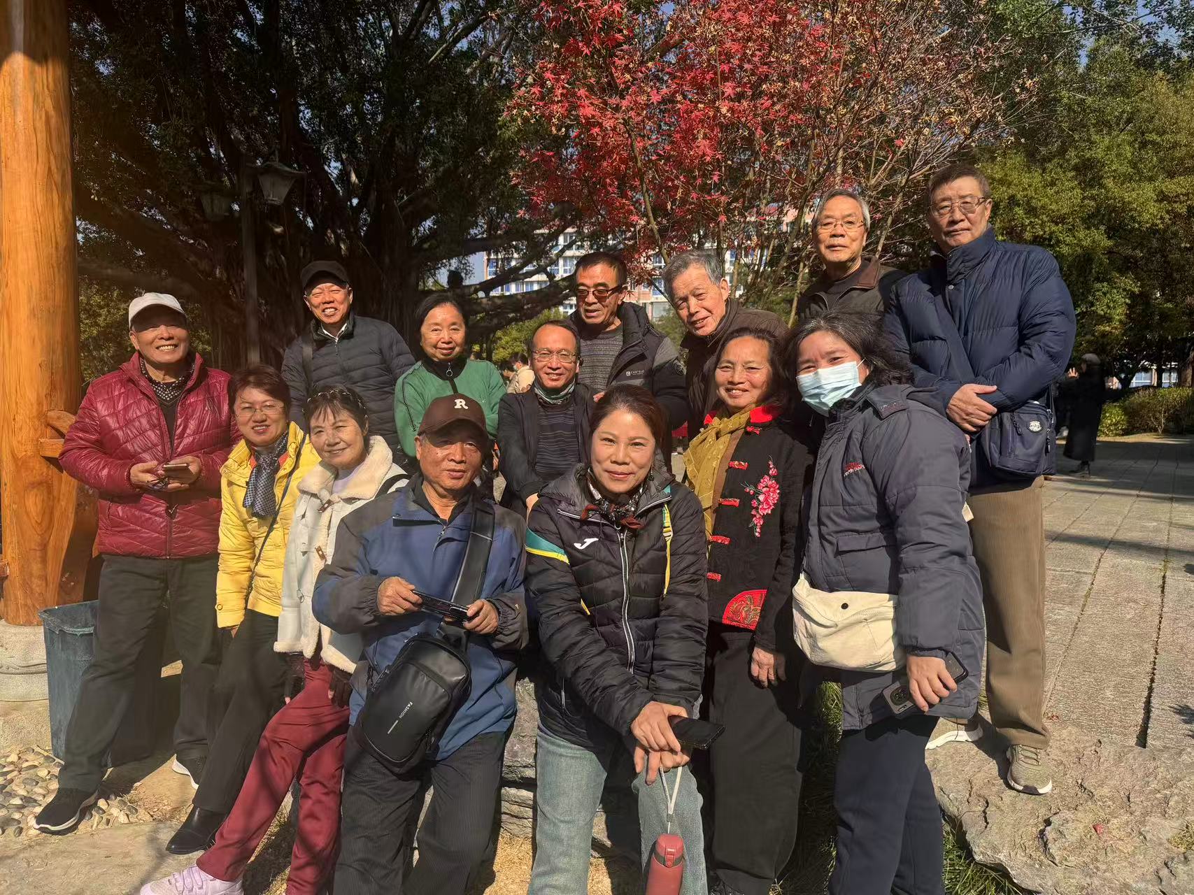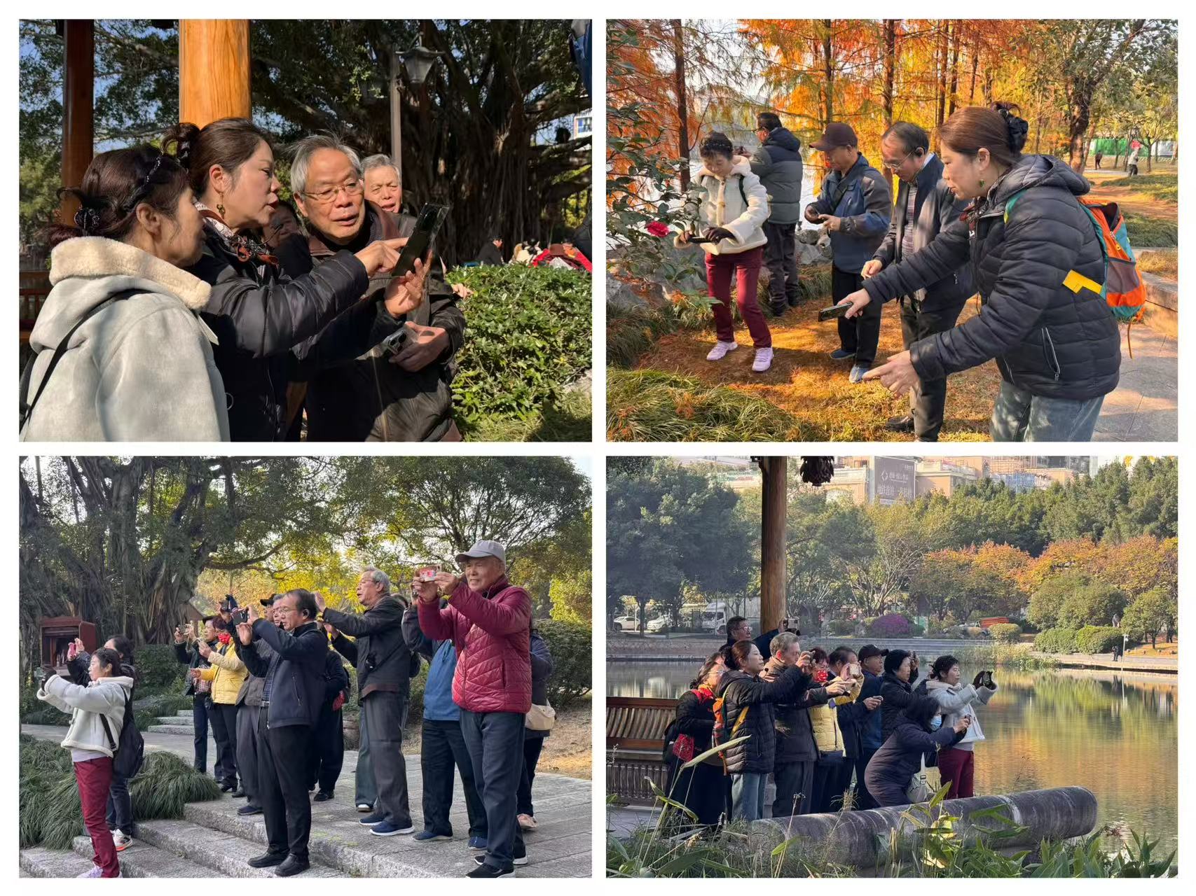 课程期间,教师围绕如何表现冬季植物的色彩与园林建筑的意境进行了现场指导。老同志们兴致盎然,将镜头对准了公园里巍然挺立的水杉、鲜艳似火的红枫叶与飞檐翘角的古典亭子。他们或探索如何捕捉水杉林整齐排列的线条感,或琢磨红枫叶在逆光下的透亮质感,或精心构图以展现亭台与自然景致的和谐之美。现场学习氛围浓厚,老同志们互相切磋、分享拍摄心得,在轻松愉快的实践中提升了摄影技巧。