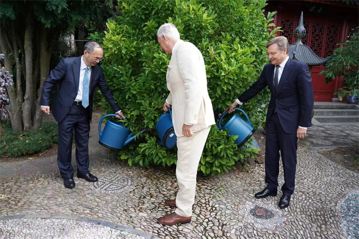 曹忠明大使、勒克莱省长与董博董事长专程到天堂动物园“中国园”为中比两国元首夫妇于2014年共同种下的象征中比友谊的玉兰树浇水、养护,共同表达对中比关系健康发展的美好祝福。中国驻比利时大使馆供图