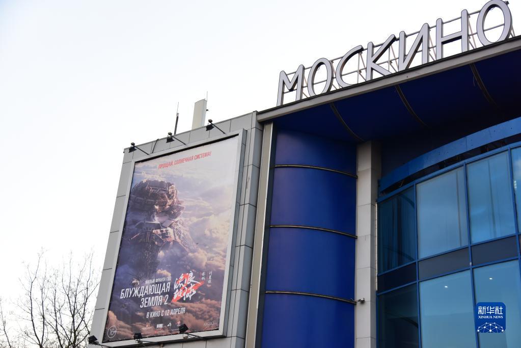 这是4月11日在俄罗斯首都莫斯科“莫斯科电影”旗下的宇宙电影院外拍摄的《流浪地球2》电影宣传海报。中国科幻电影《流浪地球2》俄文版首映式11日晚在俄罗斯连锁影院“莫斯科电影”旗下的宇宙电影院举行。俄政府官员、文化艺术界人士以及在俄中国留学生、华侨华人等参加首映式。新华社记者 华迪 摄